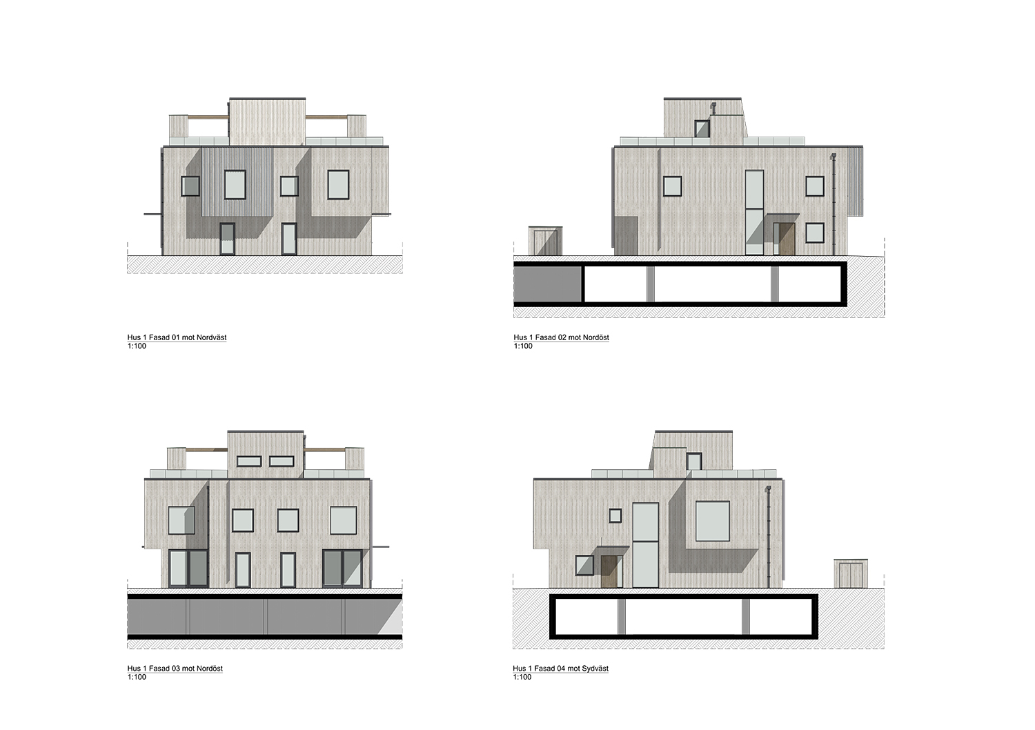 Huset är det första parhus som du möts av när du närmar dig längs Eriksgatan från väst. Bygganden har ett modernt formspråk med stora glaspartier och inslag av kuber. Fasaden har en ljus värmebehandlad träpanel som förstärker villakänslan och anknytningen till närliggande småhus. Huset har 2 bostäder med 5 rok på 169 m2. Med egen privat gård och uteplats egen takterrass samt ett utvändigt förråd.
