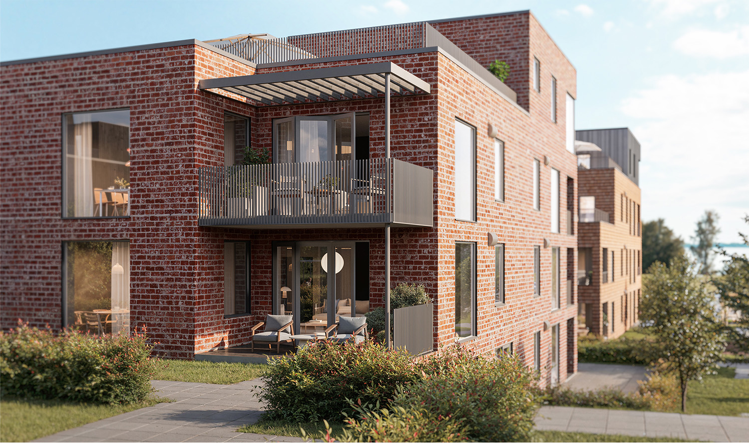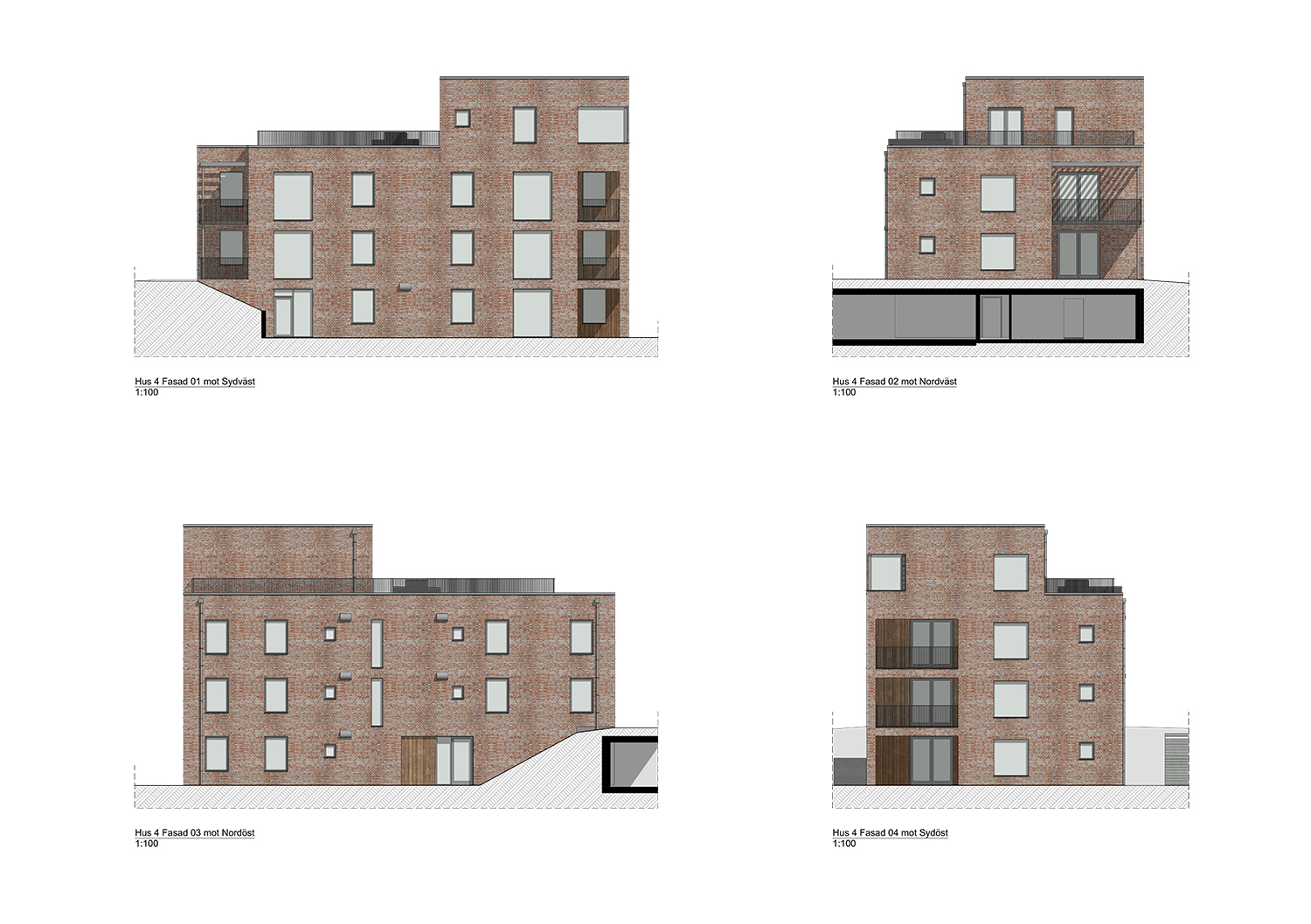 Huset har en fasad i klassiskt tegel åt rödare håll men den släta fogen ger ett mer livfullt och spännande uttryck. Huset har en form i fin skala och kröns av en takterrass. Byggnaden har 6st lägenheter med ytor mellan 49-165m2 och erbjuder något åt alla. Där lägenheterna i markplan bl.a får stora uteplatser .