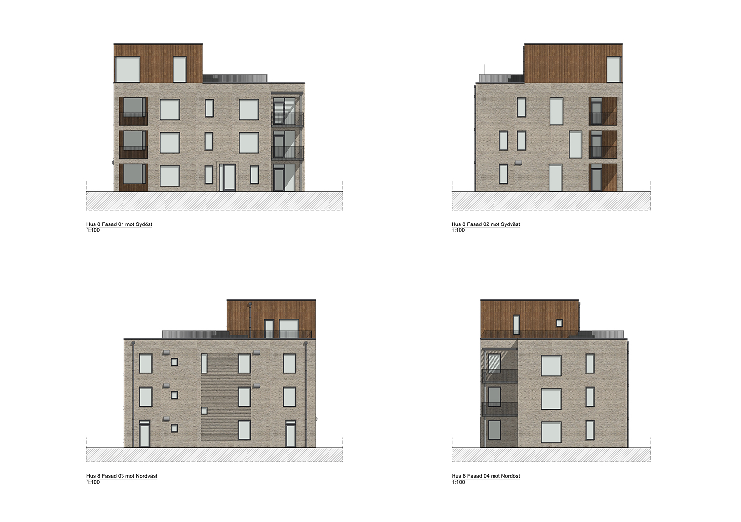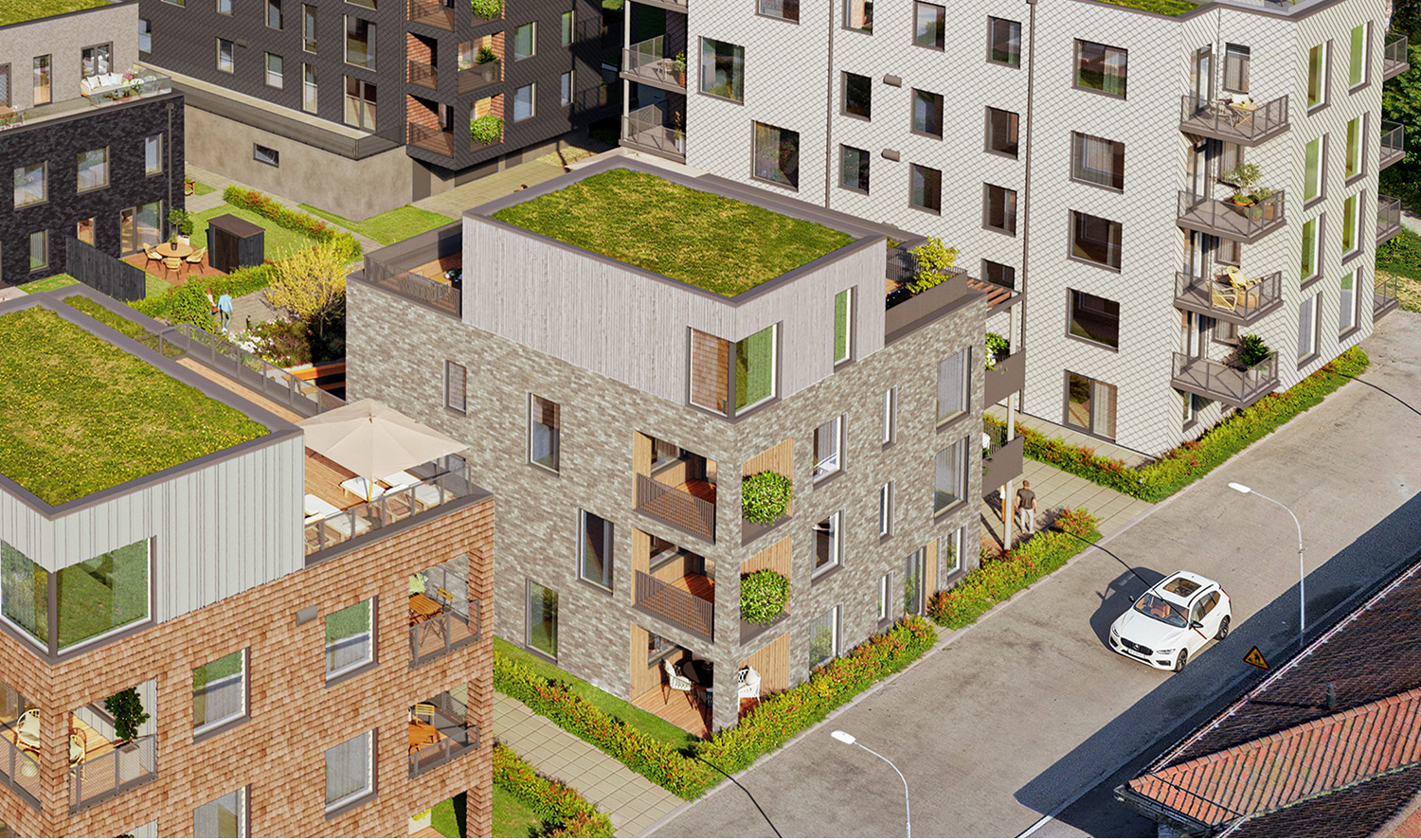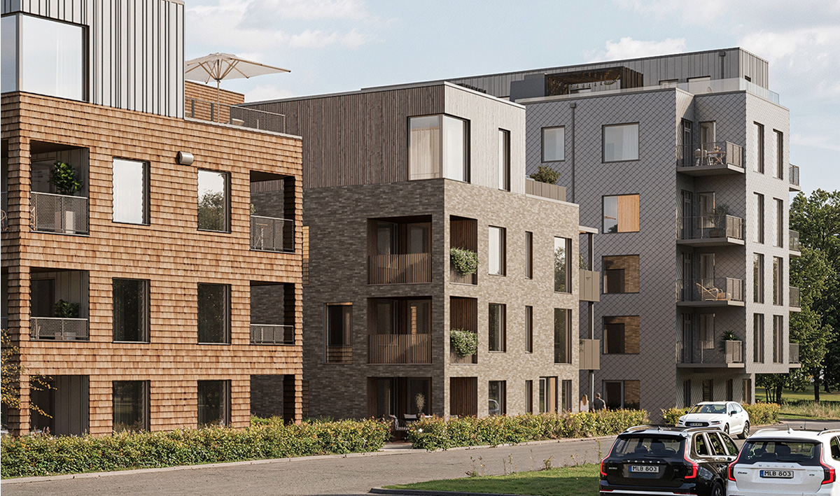 Med sin ljust grådämpade ton på tegel ges huset ett modernt intryck där översta volymen fått en noggrant utvald träpanel som harmoniserar väl med teglets ton. Samma panel följer byggnaden som en röd tråd och återfinns vid balkonger och vid den välkommande entrén. I denna byggnad ryms 6 stycken lägenheter på ytor mellan 59-148m2